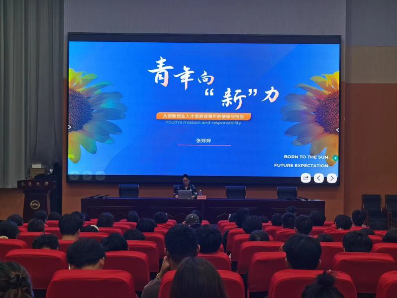 张婷婷围绕高校创新创业教育以“青春向新力”为题做精彩分享。报告中,张婷婷结合自己“六个一”的理念,即“一次调查”、“一位学生”“一项工作”、“一种召唤”、“一个未来”、“一番思考”,分享她在创新创业人才培养方面的独到见解和实践经验。她鼓励学弟学妹要勇于面对新时代、新征程上的新挑战,不断提出新的目标,担负起新的使命,创造出新时代青年人的新作为。张婷婷在报告中和学弟学妹深入交流和互动,解答他们在创新创业过程中的疑惑和困惑,分享自己的心得和体会,帮助同学们更加明确自己的职业规划和人生目标,毕业后能够为实现个人价值和社会价值做出更大的贡献。