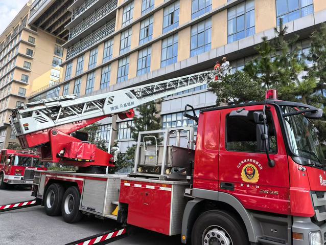 此次演练分为火场疏散逃生、被困人员救援、危化品泄露处理和消防灭火实操四个环节。在火场疏散逃生环节,接到撤离信号后,参演学生在楼层引导员的带领下,用湿毛巾捂住口鼻,俯身快速有序沿安全通道撤离到纺化楼前空地,班级负责人全程跟进清点人数,确保每一名同学安全撤离;在被困人员救援环节,接到“被困人员”在窗口挥舞毛巾大声呼救的信号,消防员使用云梯攀至三楼窗口处,帮助被困同学穿戴好防护服、戴好消防头盔后缓慢降至地面,成功救出被困同学;在危化品泄露处理环节,在实验中心主任张跃华老师的现场指导下,学院两名研究生身着防护服,持消防水枪迅速扑灭易燃易爆物品明火,同时为在场同学演示了硫酸液体泄漏的正确处理方法和步骤;在灭火实操环节,消防安全管理科老师演示了干粉灭火器与二氧化碳灭火器的正确使用方法,随后组织师生进行现场油盆灭火实操练习。大家积极参与、动手实践,提高了师生面对火灾时的应急反应能力和实际操作技能。