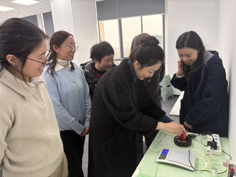口红DIY环节是本次活动的高潮。学院单佳慧老师为大家介绍了DIY口红的制作步骤和注意事项。调制配方对化院女教职工们来说是“小菜一碟”,她们纷纷化身“美妆达人”,精准称量、加热、混匀、分装、固化、脱模,制作出自己的专属口红。活动现场欢声笑语不断,大家互相交流制作心得,分享美丽秘诀,尽情享受着DIY的乐趣。女性的贤惠干练节俭充分显现:活动后的现场干净如初,能回收利用的绝不浪费, 不留任何垃圾和印痕!