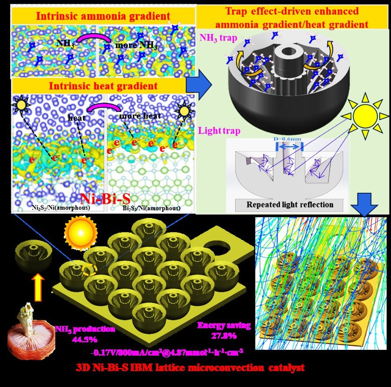 本研究设计了一种三维异质陷阱结构催化剂。该催化剂通过其独特的非均相陷阱结构,显著增强了表面的NH3浓度梯度和热梯度,进而诱导产生了更为强烈的热/NH3微对流。在工业级800 mA/cm²电流密度和电-光耦合场条件下,该催化剂仅需-0.17 V(vs. RHE)的超低极化电位即可实现高达4.87 mmol h-1 cm-2的氨产率。与传统的纯电场催化体系相比,NH3产率最高可提升44.5%,同时能源消耗最高可降低27.8%。