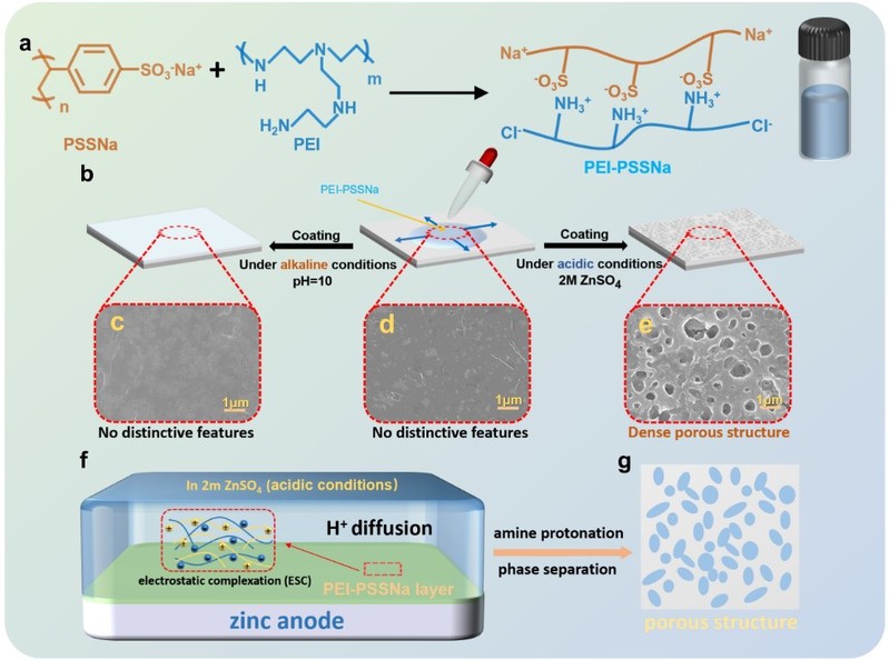水系锌离子电池凭借高安全性、优异环保性,以及理论比容量高、氧化电位低的突出优势,被视为极具产业化前景的储能技术方向。然而,在循环过程中的锌沉积/剥离阶段,普遍面临内部腐蚀、析氢副反应及锌枝晶无序生长等关键问题,这不仅加剧电池性能衰减,更严重制约了其向产业化应用的推进进程。本研究提出了一种创新方法,该方法在弱酸溶液中结合静电复合与相分离作用,诱导形成酸响应性多孔聚电解质膜。该技术使锌阳极在40 mA cm-2高电流密度下的使用寿命延长至900小时。此外,Zn@PEI-PSSNa阳极展现出优异的锌利用率,在高放电深度下可持续工作200小时。Zn@PEI-PSSNa||Cu电池更表现出长期循环稳定性,在近4000小时测试中保持99.8%的超高库仑效率(CE)。实验分析与模拟结果表明,磺酸基与氨基官能团协同多孔结构可增强亲锌性,促进Zn2+传输,从而实现均匀的锌沉积、加速去溶剂化过程并抑制副反应。