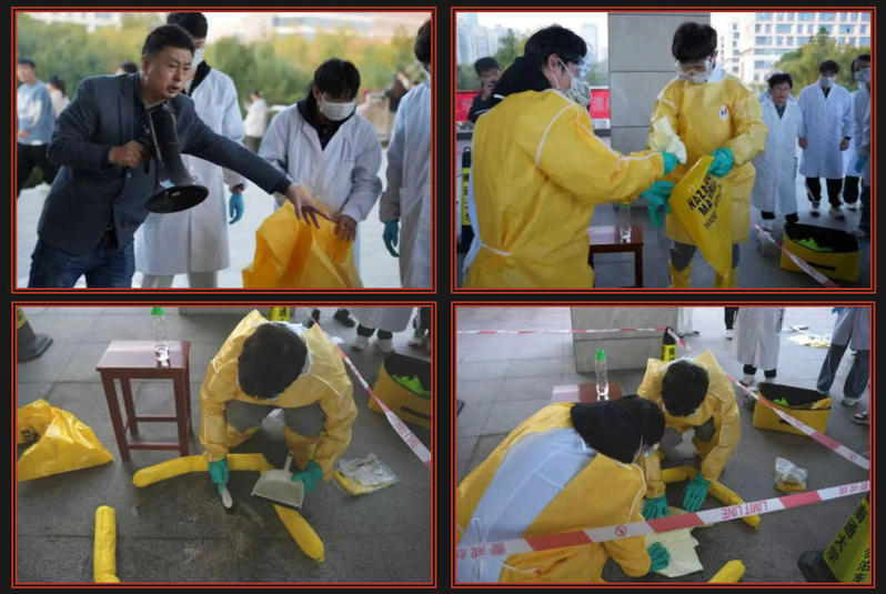 在危化品泄漏应急演练环节,实验中心主任张跃华老师全程指导。师生规范穿戴防护服后,相互核查穿戴合规性,随即以围挡划定泄漏警戒区,用吸油棉吸附地面泄漏液体。吸附完毕后,均匀撒布强烈吸附剂,再对污染物进行规范收集。所有处理结束后立即至应急喷淋区清洗手套,按流程脱下防护服。在场师生踊跃参与实操,掌握了酸性液体泄漏的规范处置流程与方法。