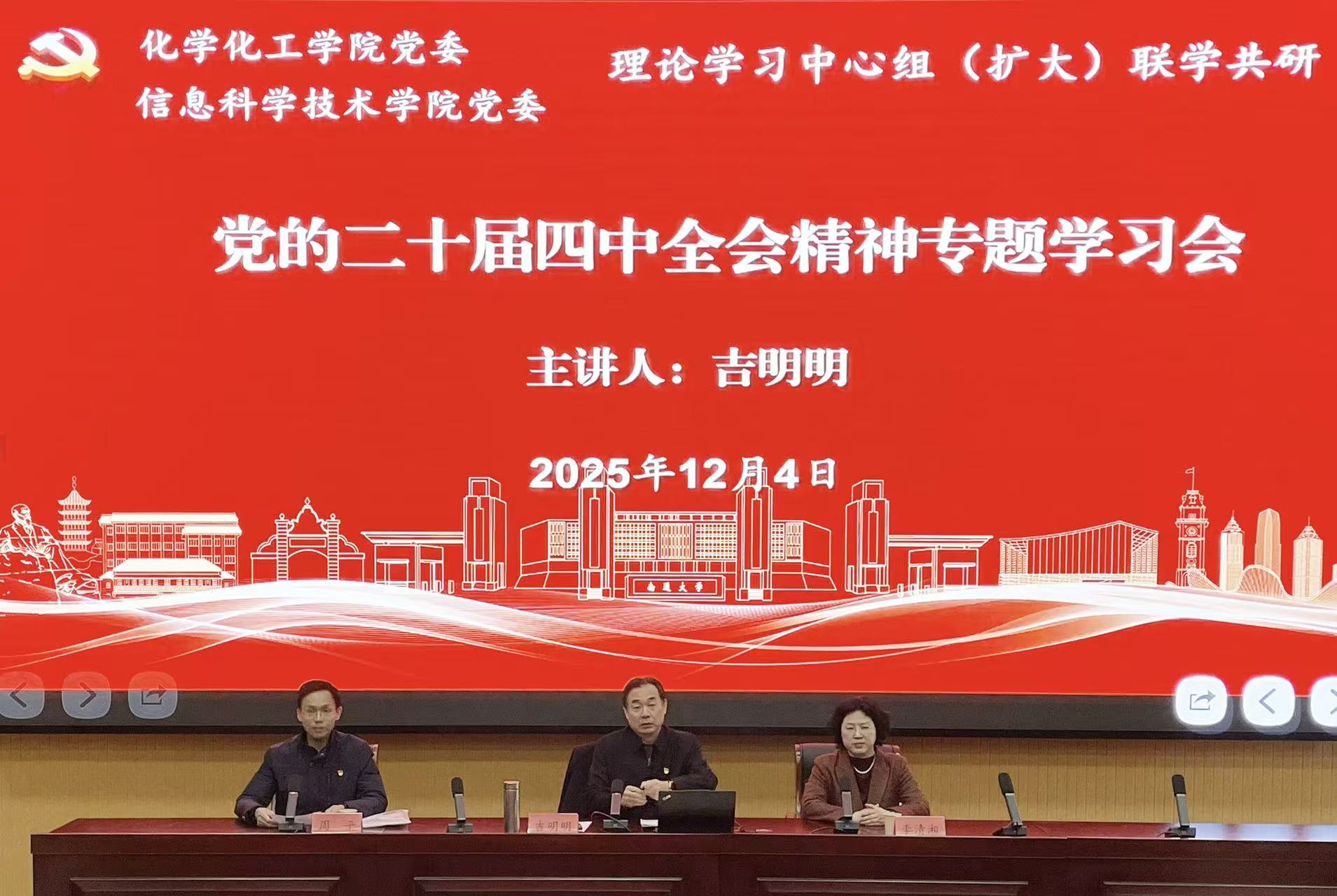 12月4日,yl6809永利官网集团党委、信息科学技术学院党委理论学习中心组(扩大)开展了专题学习贯彻党的二十届四中全会精神的联学共研活动,活动邀请市委宣讲团成员、校党委常委、副校长吉明明做专题报告。